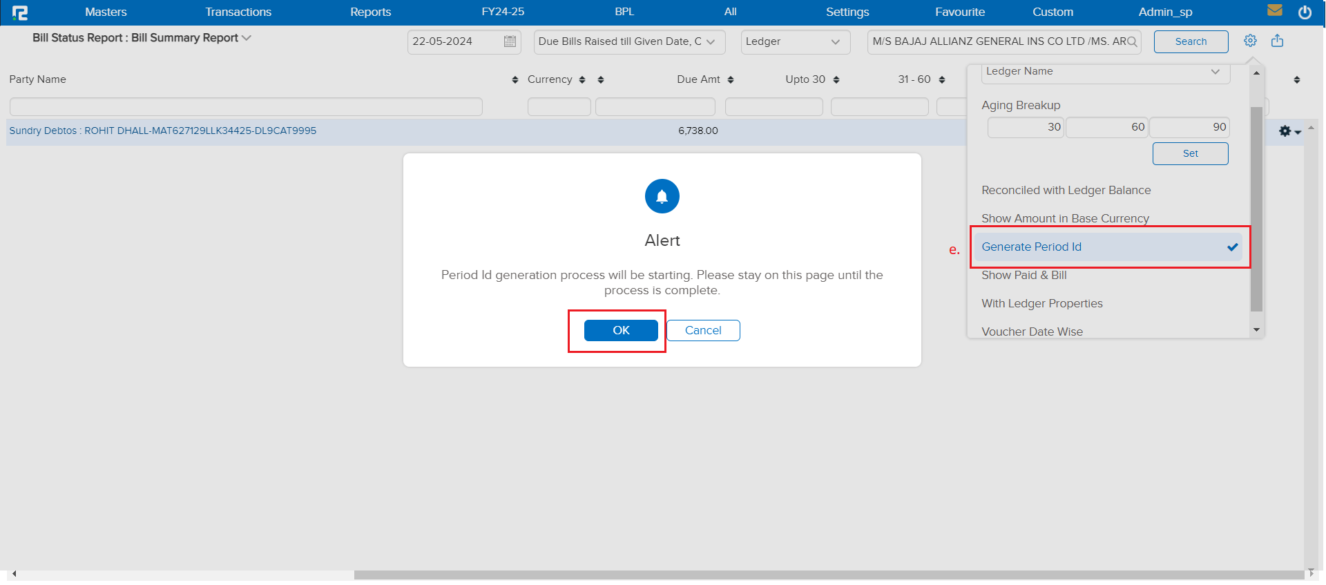 e. Generate Period Id: The feature creates a unique identifier for the reporting period. This can be used for tracking and referencing specific reporting periods. A pop-up will appear to approve the period report generation; click “OK” to confirm.