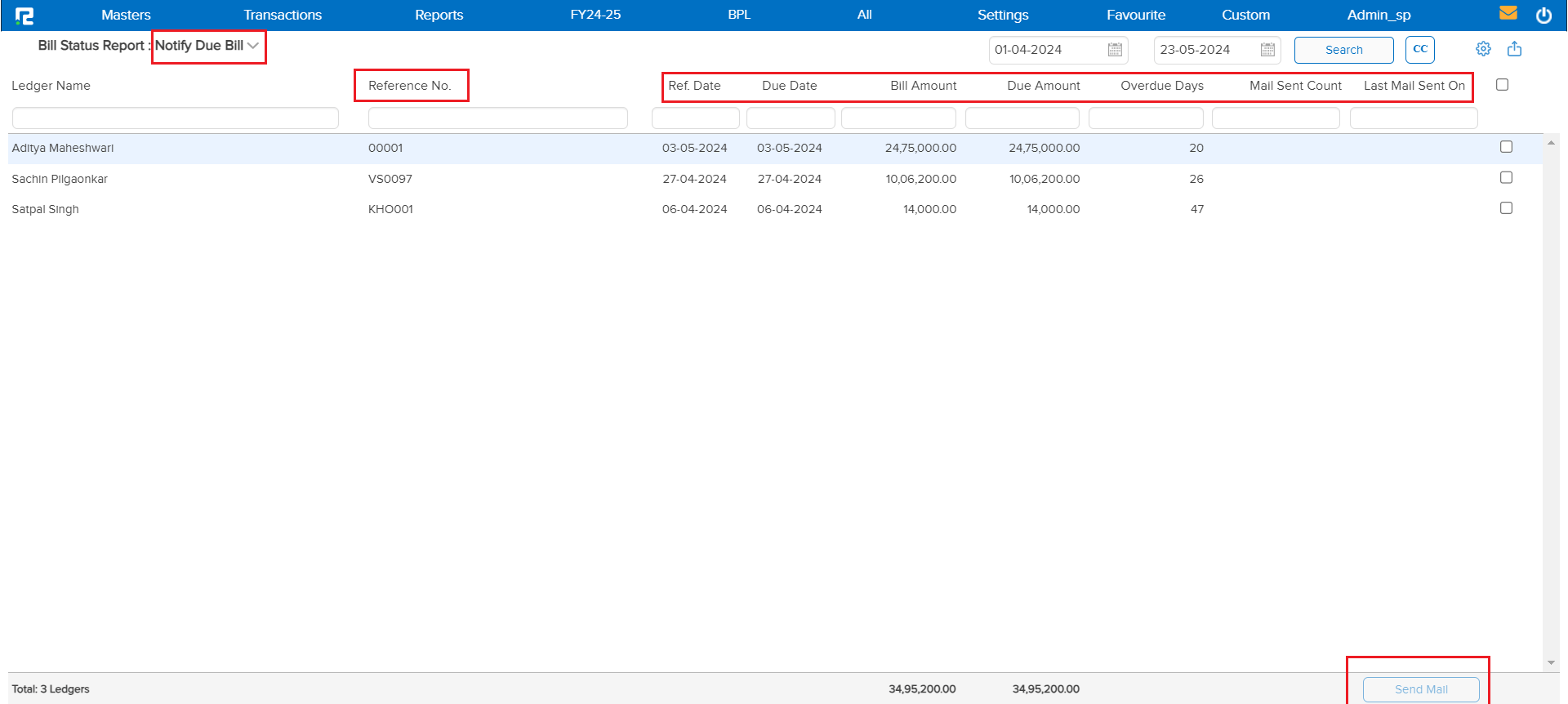This report provides detailed bills that are due or nearly their due dates including “Bill Reference Number”, “Date”, “Due amount”, and “Overdue days. Potentially trigger a notification for follow-ups with a “Send mail” option.