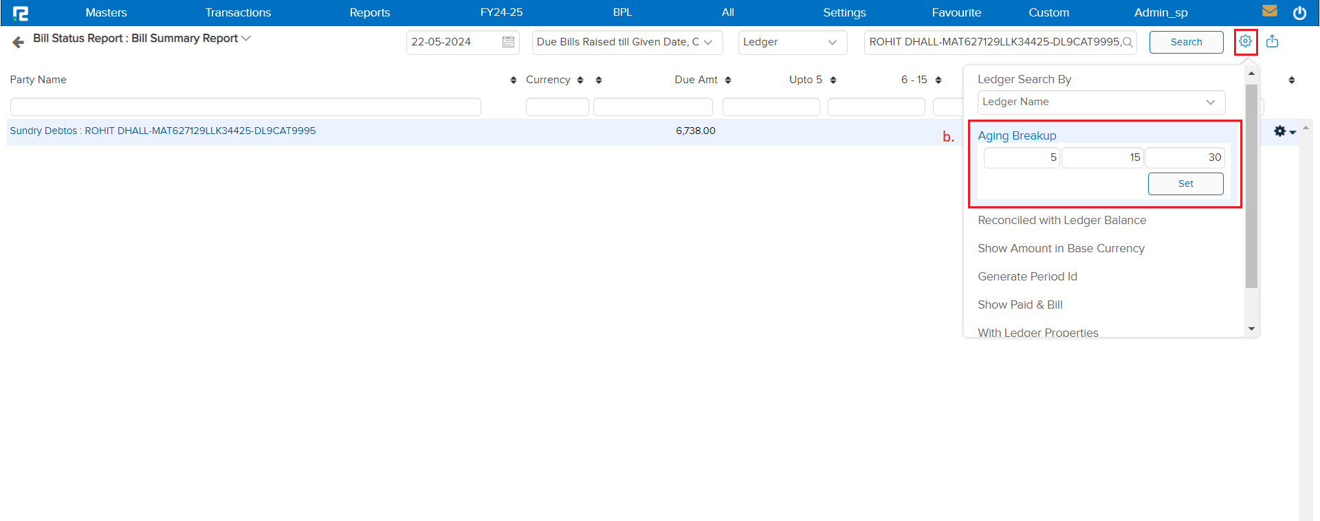 b. Aging Breakup: By default, the aging periods will be selected as (30, 60, or 90 days) to view the outstanding dues based on different time frames. Click “Set” to apply the Custom Period.