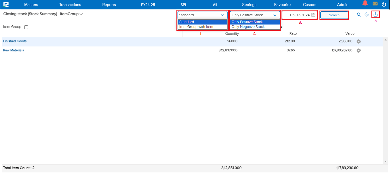 1. Standard – Here are two options to search the report standard or item group with the item.