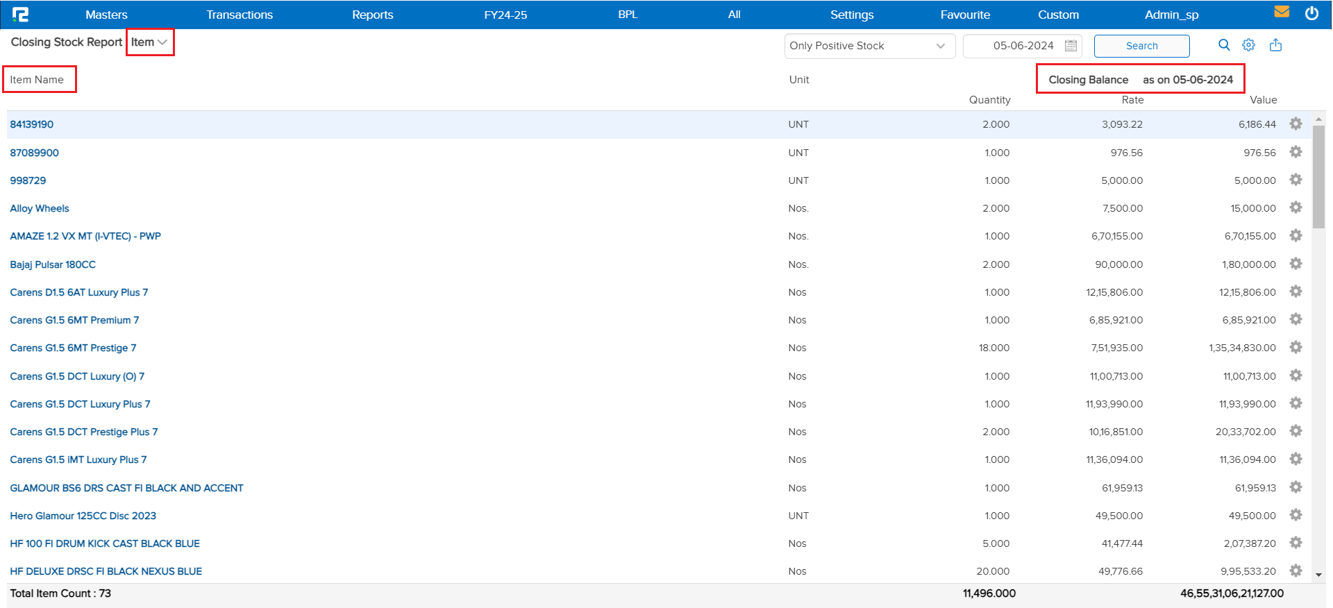 At the bottom of the report, the total item count and aggregate value of the closing stock are displayed, offering a quick summary of the inventory status.
