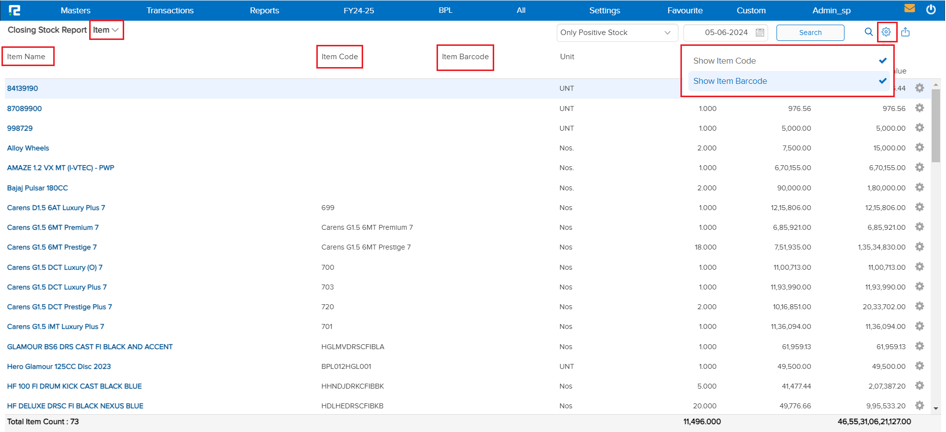 Settings: Click on the settings icon (gear icon), This feature provides a drop-down menu that will appear with options to Show “Item Code” and “Item Barcode”.