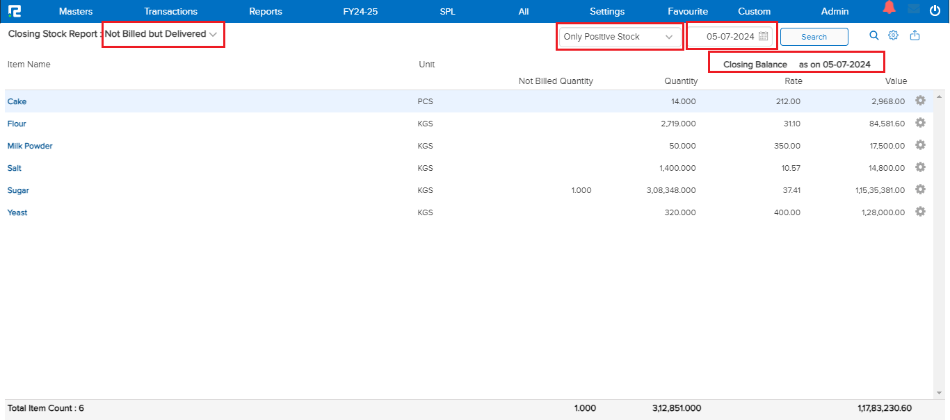 Not Billed But Delivered: This section lists items that have been delivered to customers or received by your business but have not been invoiced. This report shows the Item name, quantity, and value of the items delivered but not yet billed.