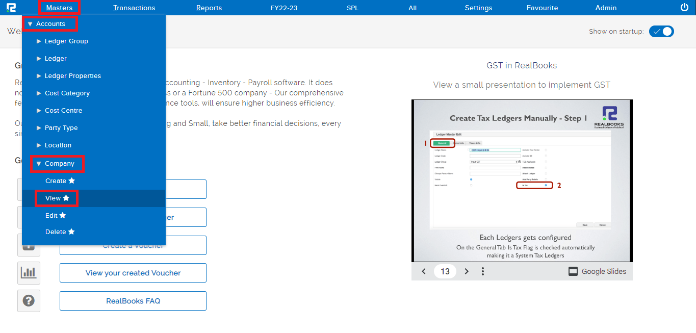 STEP 1: Go to Masters ⇒ Accounts ⇒ Company ⇒ View