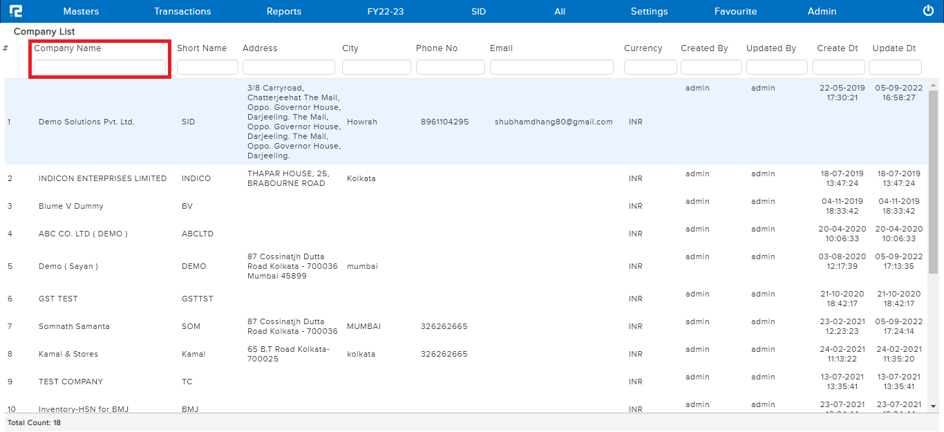 STEP 2: Once you click on view option, The entire list of existing companies will be displayed here. In the case of long lists, it is easy to filter the data by searching for the name under the Company Name.