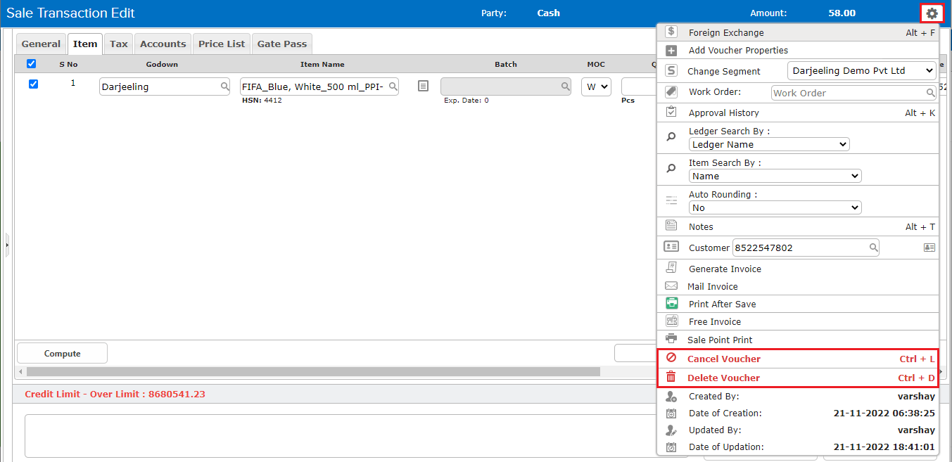 DELETE/CANCEL– To delete/cancel an entry, open the entry in edit mode, then go to the Settings icon on the right-hand side of the page. From the dropdown menu select the cancel/delete voucher as required, enter the reason for cancellation/deletion, and then click on cancel/delete.