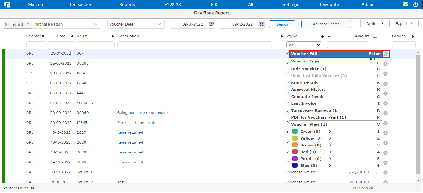 Users can view, edit, cancel, or delete a purchase return entry from almost every report available in the system. For ex: day book, purchase register, etc.