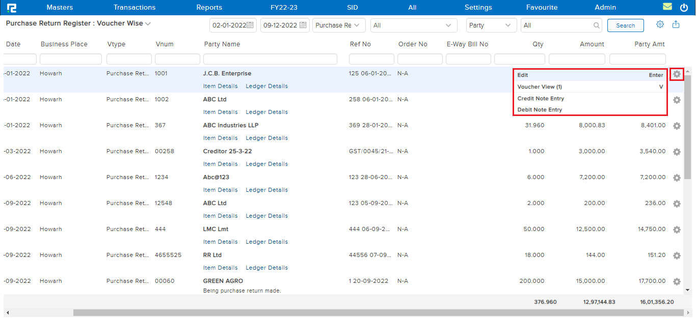 To edit an entry, click on the settings icon on the right-hand side of the entry & click on the Voucher Edit option, or alternatively, press Enter on the keyboard.
