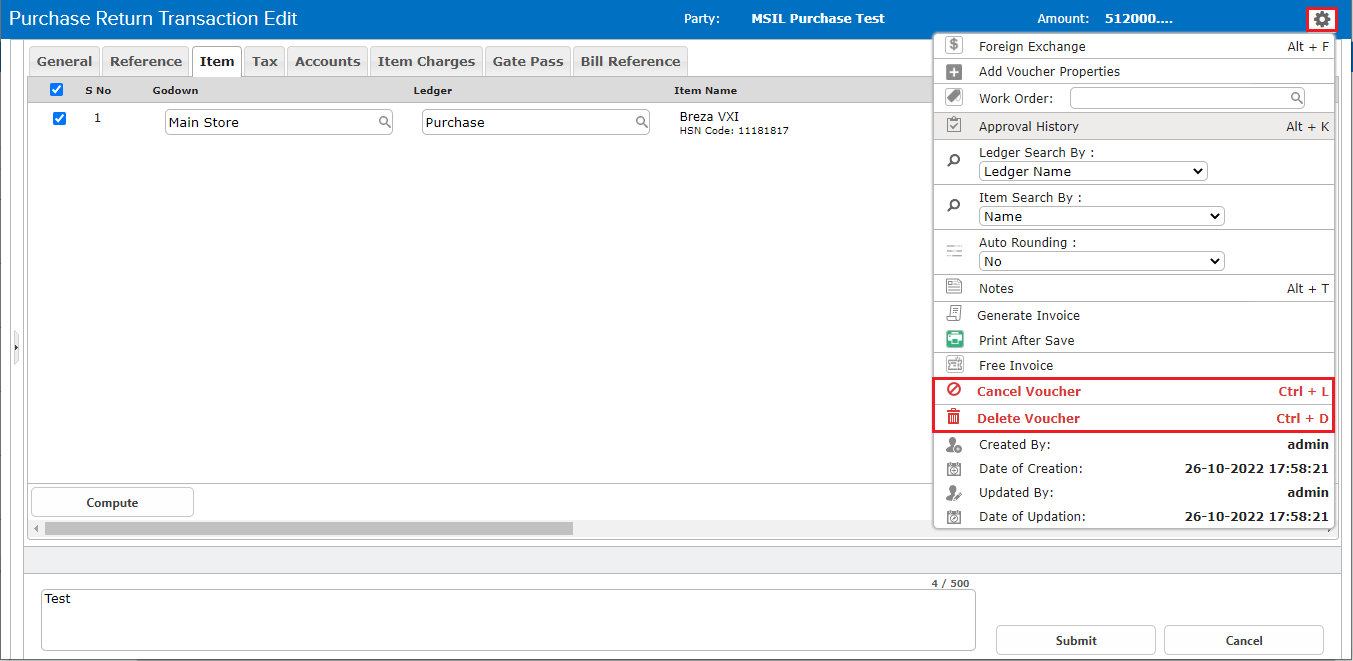 DELETE/CANCEL– To delete/cancel an entry, open the entry in edit mode, then go to the Settings icon on the right-hand side of the page. From the dropdown menu select the cancel/delete voucher as required, enter the reason for cancellation/deletion, and then click on cancel/delete.