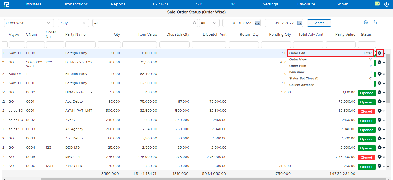 TRANSACTION EDIT VIA SALE ORDER STATUS REPORT