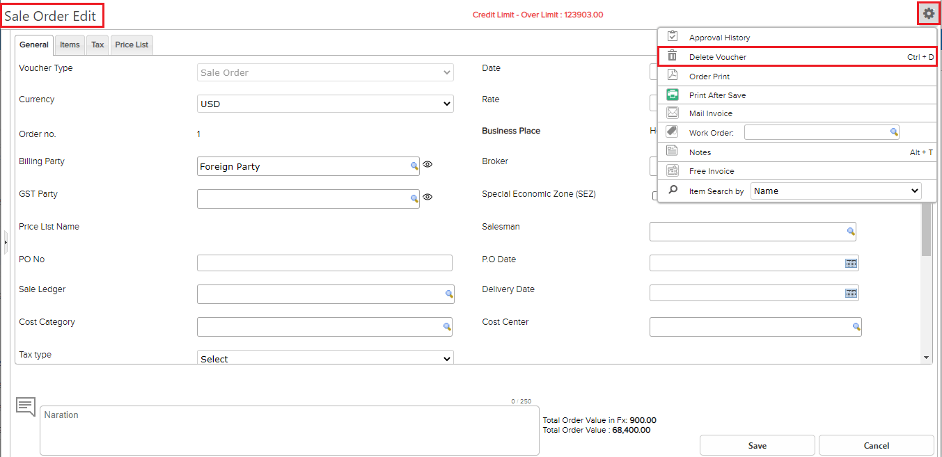 DELETE– To delete an entry, open the entry in edit mode, then go to the Settings icon on the right-hand side of the page. From the drop-down menu select the delete voucher as required, enter the reason for deletion, and then click on delete.
