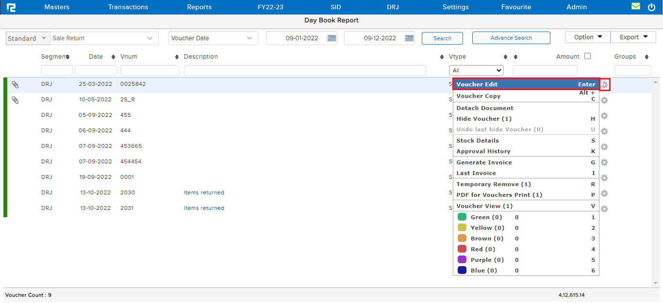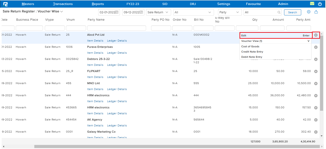To edit an entry, click on the settings icon on the right-hand side of the entry & click on the Voucher Edit option, or alternatively, press Enter on the keyboard.
