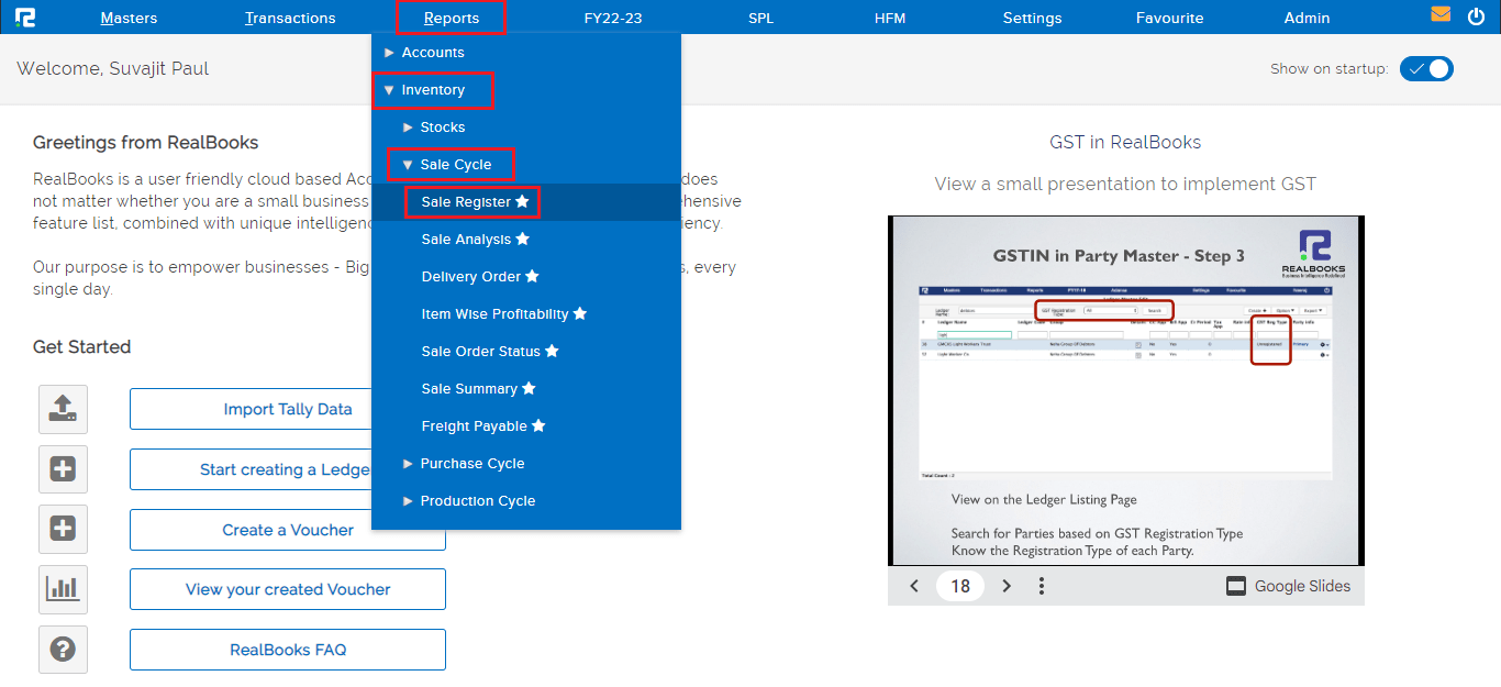 Go to Reports⇒ Inventory⇒ Sale Cycle⇒ Sale Register