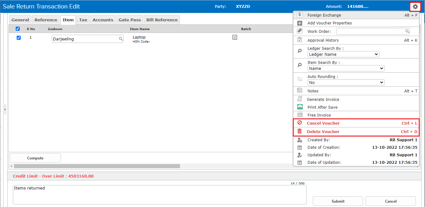 DELETE/CANCEL– To delete/cancel an entry, open the entry in edit mode, then go to the Settings icon on the right-hand side of the page. From the dropdown menu select the cancel/delete voucher as required, enter the reason for cancellation/deletion, and then click on cancel/delete.