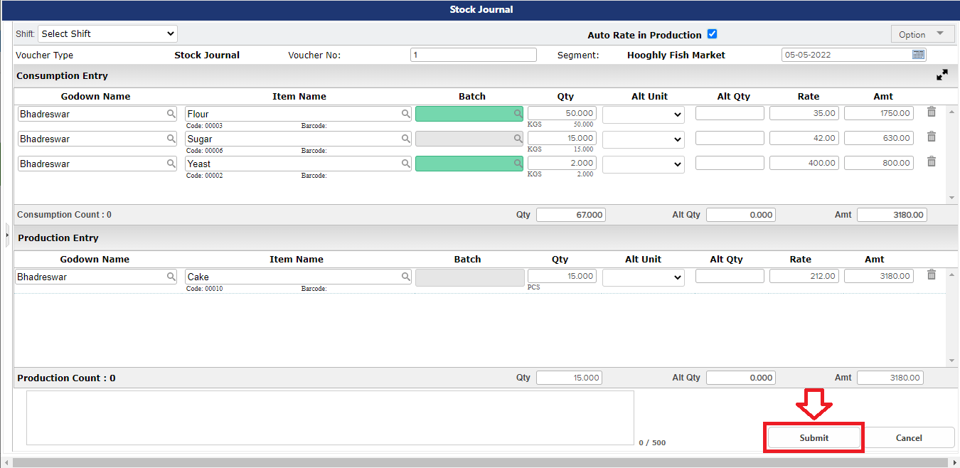 Note: a) If Auto Rate in Production is enabled, then the production value will be considered the same as the total value of the consumption part. In case, the production value needs to be manually entered, please uncheck the option.